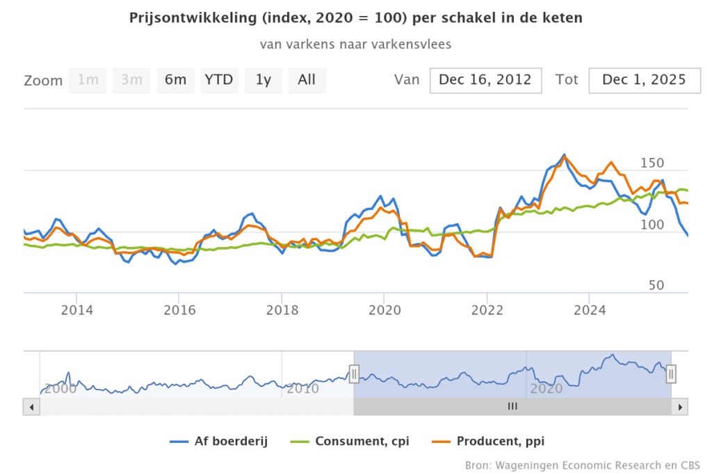 In november 2025 kwam de consumentenprijsindex (CPI) voor varkensvlees uit op 134 punten, vrijwel gelijk aan oktober en ruim 7% hoger dan in november 2024. De producentenprijsindex (PPI) lag op 124 punten, een daling van 6% ten opzichte van twee maanden daarvoor en circa 5% onder het niveau van november 2024. De af-boerderijprijs (API) is in de afgelopen maanden sterk gedaald (-15%): van 119 punten in september naar 101 punten in november 2025. Daarmee ligt de af-boerderijprijs inmiddels ruim 18% lager dan in november 2024. Deze ontwikkeling leidt tot een sterk toenemende prijsdruk bij varkenshouders, terwijl de prijsdalingen in de verwerking beperkt blijven en consumentenprijzen hoog blijven.