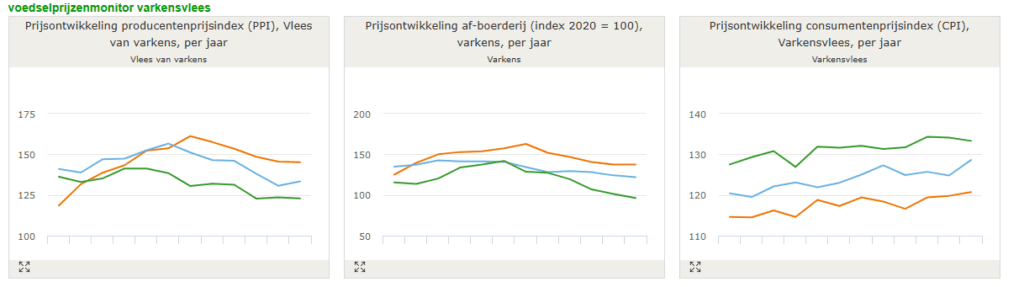 De consumentenprijsindex (CPI) is gebaseerd op varkensvlees bij supermarkten en slagers. De producentenprijsindex (PPI) is gebaseerd op de opbrengstprijzen van producenten van vers of gekoeld varkensvlees bij afzet naar het binnenland. De af-boerderijprijs is gebaseerd op de wekelijkse noteringen voor slachtvarkens. De indices zijn begin 2024 herzien, waarbij het jaar 2020 op 100% is gezet.
