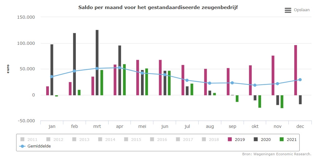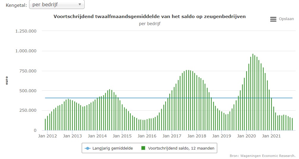 Het voortschrijdend jaarsaldo van zeugen lag in november 246.000 euro onder het langjarig gemiddelde. In april 2020 werd nog de top bereikt van 562.000 euro per bedrijf (625 euro per zeug) boven het langjarig gemiddelde. Daarna zette een daling in die nog niet is gestopt. In november 2021 daalde het voortschrijdend jaarsaldo naar 178 euro per zeug, tegen een langjarig gemiddelde van 452 euro per zeug.