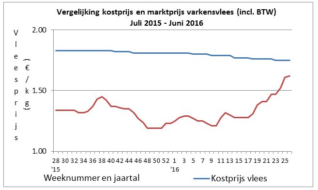 In het Landelijk Biggenprijzenschema worden de kostprijzen van biggen en vleesvarkens berekend. In de maand juli van ieder jaar wordt een vernieuwd kostprijzenschema uitgebracht. Doordat de voerprijzen het afgelopen jaar verder gedaald zijn en de technische resultaten verder verbeterd zijn, is de kostprijs (incl. BTW) van biggen weer beneden de € 55 beland. De kostprijs van vlees is in een jaar tijd ruim 4% gedaald, maar ligt nog 5-10% hoger dan momenteel door de slachterijen betaald wordt. Een jaar geleden was dit verschil nog 30%, maar de marktprijs is de afgelopen twee maanden 25% gestegen. De voerkosten bepalen meer dan de helft van de kostprijs van vleesvarkens (inclusief voer biggen) en de lichte daling in kostprijs is vrijwel geheel toe te schrijven aan lagere voerprijzen.