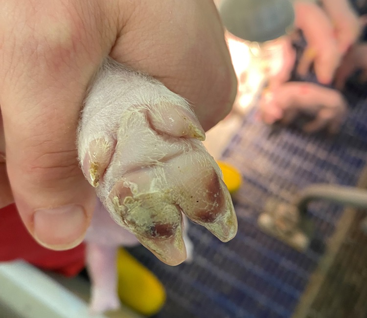 SINS (Swine Inflammation and Necrosis Syndrome) is een aandoening waarbij verspreid in het lichaam ontstekingen ontstaan. Dit ontstaat door een darmverstoring bij de big zelf of, in het geval van pasgeboren biggen, zelfs al bij de dragende zeug. Hierbij worden stressfactoren gevormd, waardoor de darmcellen een beetje gaan lekken. De gifstoffen van bacteriën in de darmen, oftewel endotoxinen, verspreiden zich in het lichaam en worden tijdens de dracht overgedragen aan de biggen. Het afweersysteem reageert hierop en dit veroorzaakt (kleine) ontstekingshaarden. Aan de buitenkant is dit zichtbaar als roodheid, zwellingen, haarverlies en in een later stadium necrose, waarbij het weefsel afsterft. Met name de staart, oren, gezicht, speentjes en voetzolen worden aangetast. “Biggen met SINS zijn als het ware geherprogrammeerd. Het afweersysteem is gevoeliger geworden voor stress, waardoor sneller ontstekingshaarden ontstaan”, legt vertelt Karien Koenders, dierenarts bij Dierenartsenpraktijk Lintjeshof, uit.