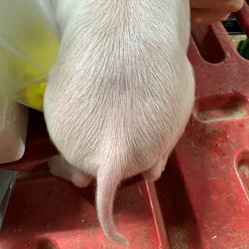 Op foto A is een goede staart zichbaar. De symptomen van SINS kunnen variëren van haarverlies (B), roodheid en zwelling (C), tot weefselafsterving (D). Lang niet alle biggen met SINS vertonen dermate ernstige aanstastingen.