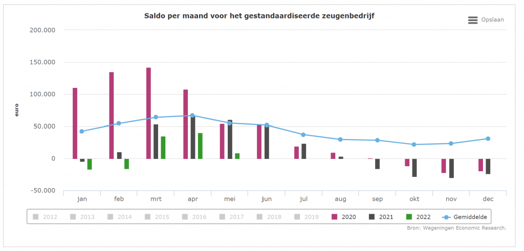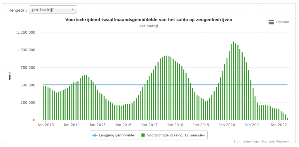 Het voortschrijdend jaarsaldo van zeugen lag in mei 471.000 euro onder het langjarig gemiddelde. In april 2020 werd nog de top bereikt van 621.000 euro per bedrijf (621 euro per zeug) boven het langjarig gemiddelde. Daarna zette een daling in die nog niet is gestopt. In mei 2022 daalde het voortschrijdend jaarsaldo naar 33 euro per zeug, tegen een langjarig gemiddelde van 504 euro per zeug.