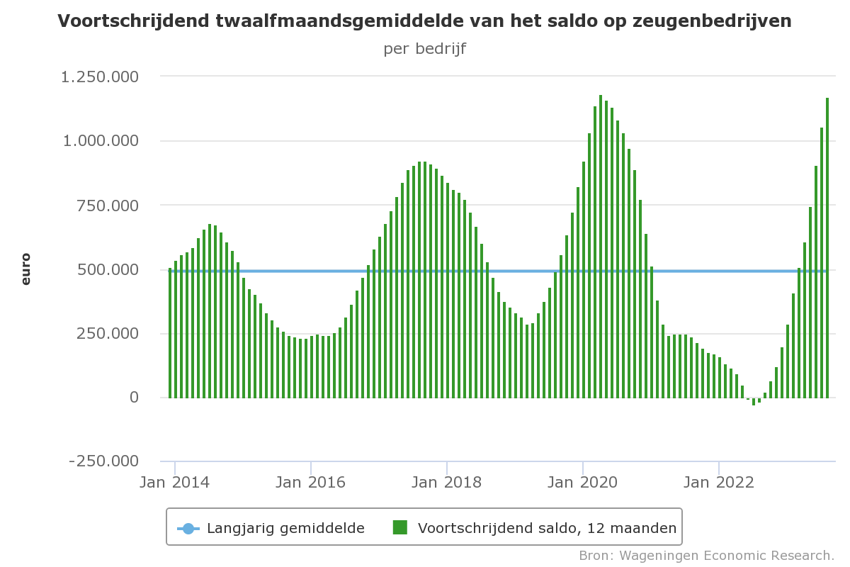 Het voortschrijdend jaarsaldo van zeugen blijft boven het langjarige gemiddelde liggen. Hoewel in juli 2022 een dieptepunt werd genoteerd met 518.000 euro onder het langjarige gemiddelde, heeft een sterk herstel in de daaropvolgende maanden ervoor gezorgd dat in augustus een saldo werd bereikt dat ruim 680.000 euro boven dit gemiddelde ligt.