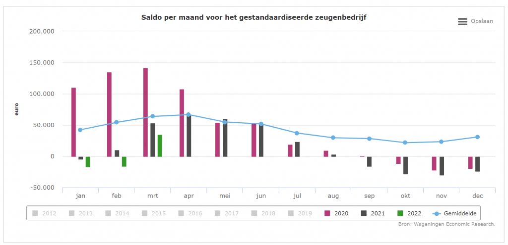 Het voortschrijdend jaarsaldo van zeugen lag in maart 393.000 euro onder het langjarig gemiddelde. In april 2020 werd een top bereikt van 621.000 euro per bedrijf (621 euro per zeug). Daarna zette een daling in die nog niet is gestopt. In maart 2022 daalde het voortschrijdend jaarsaldo naar 110 euro per zeug, tegen een langjarig gemiddelde van 504 euro per zeug.