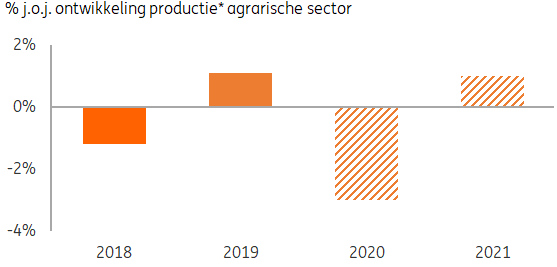 Na de 1% productiegroei in 2019 – overeenkomstig het langjarig gemiddelde – krijgt de agrarische sector in 2020 met krimp te maken, van circa 3%. Voor 2021 verwachten we een inhaaleffect en een terugkeer naar de gemiddelde groei van circa 1%, ondanks externe druk van onder meer teruglopende consumentenbestedingen, internationale handelsconflicten, brexit en stikstofmaatregelen.