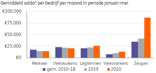 De varkensketen kreeg te maken met tegenslagen op meerdere vlakken. Varkenshouders konden een deel hun varkens niet meer kwijt aan enkele slachterijen omdat die vanwege corona onder een deel van de arbeidskrachten gesloten zijn. Bovendien was de belangrijkste Chinese afzetmarkt om diezelfde reden tijdelijk op slot voor een aantal grote Nederlandse en Duitse slachterijen. Zeugenhouders konden als gevolg hiervan hun biggen niet kwijt aan de varkenshouders met hun overvolle stallen. Na de prima rendementen vorig en begin dit jaar dankzij hoge prijzen door de varkenspest in Zuidoost-Azië was er even onzekerheid, maar inmiddels is China deels weer ‘open’ en trekken de prijzen aan. De voerwinsten liggen over de eerste 8 maanden boven het langjarig gemiddelde. Ook zeugenhouders zullen waarschijnlijk een bovengemiddeld resultaat behalen, mede dankzij de recordprijzen voor biggen in het eerste kwartaal.
