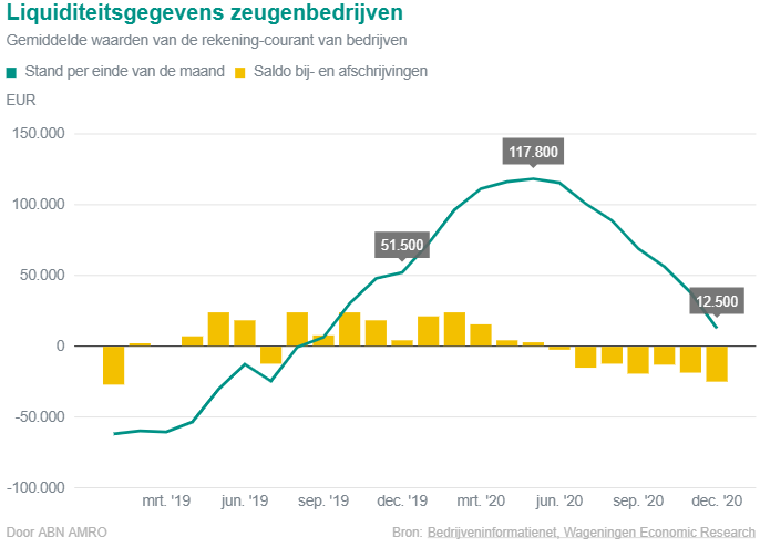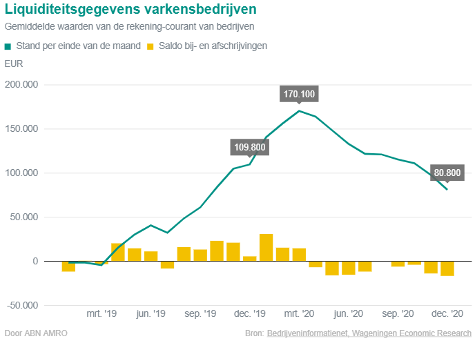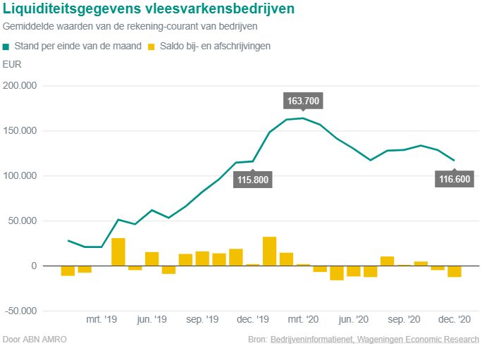 Het eerste kwartaal verliep bijzonder goed, maar de uitbraak van corona en daarna van Afrikaanse varkenspest (AVP) bij wilde zwijnen in Duitsland veranderde de varkensmarkt drastisch. De rekening-courant kwam in december 2020 uit op gemiddeld 81.000 euro. Dat is 29.000 euro lager dan december 2019. Het verloop van de liquiditeit was in 2020 ongekend grillig. Begin 2020 zette de liquiditeitsverbetering aanvankelijk nog door als gevolg van hoge vlees- en biggenprijzen. De rekening courant bereikte in maart een top van 170.000 euro. Dat was 70.000 euro hoger dan eind 2019 en 175.000 euro hoger dan in maart 2019.