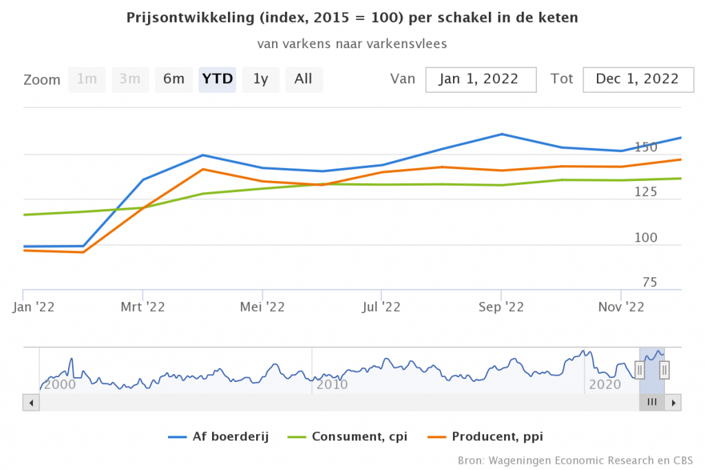 De consumentenprijs van varkensvlees is in de laatste maanden van 2022 verder gestegen naar 135 punten. Deze lag begin van dat jaar nog op 116 punten. De industrieprijs en af-boerderijprijs zijn het afgelopen jaar ook sterk gestegen, waarbij de stijging in alle drie prijsindices vooral plaatsvond rond maart-april. De industrieprijs kwam in november uit op 142 punten en de af-boerderijprijs op 151 punten. Duurder voer en hogere energiekosten spelen een belangrijke rol in de prijsstijgingen.