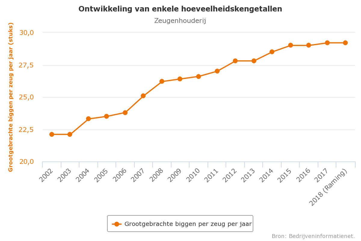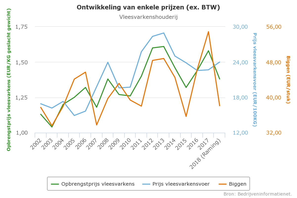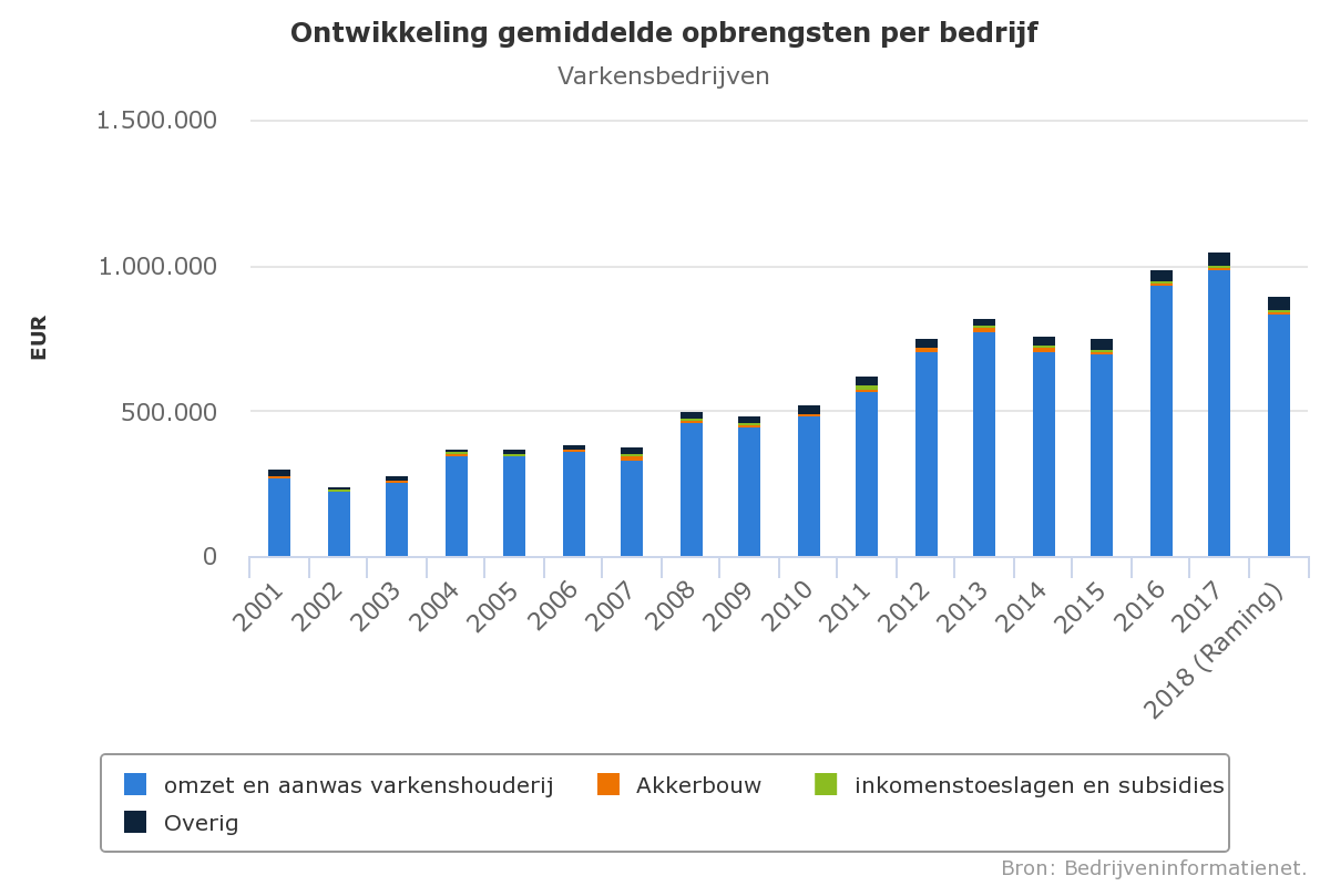 In 2018 is het gemiddelde inkomen uit bedrijf bijna 214.000 euro gedaald door fors lagere prijzen van biggen (-30%) en vleesvarkens (-12%). De voerkosten per bedrijf zijn gestegen door hogere prijzen en toename van de bedrijfsomvang.