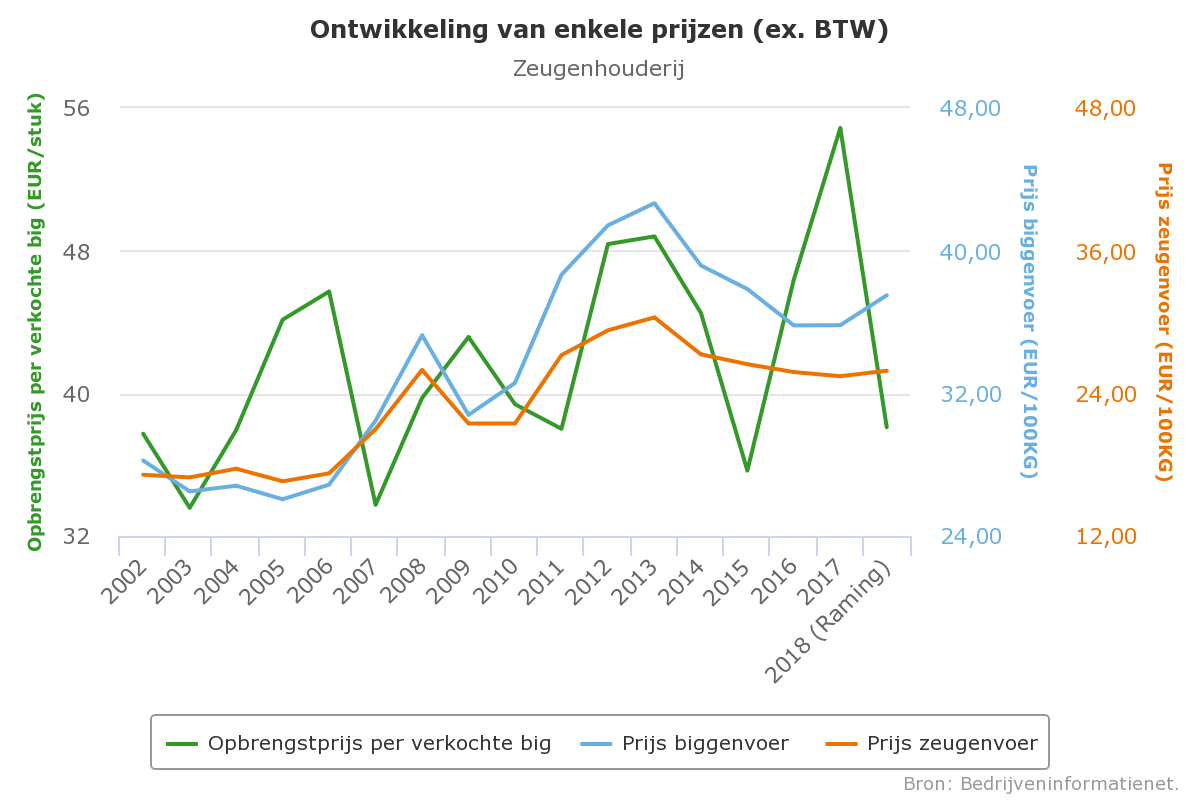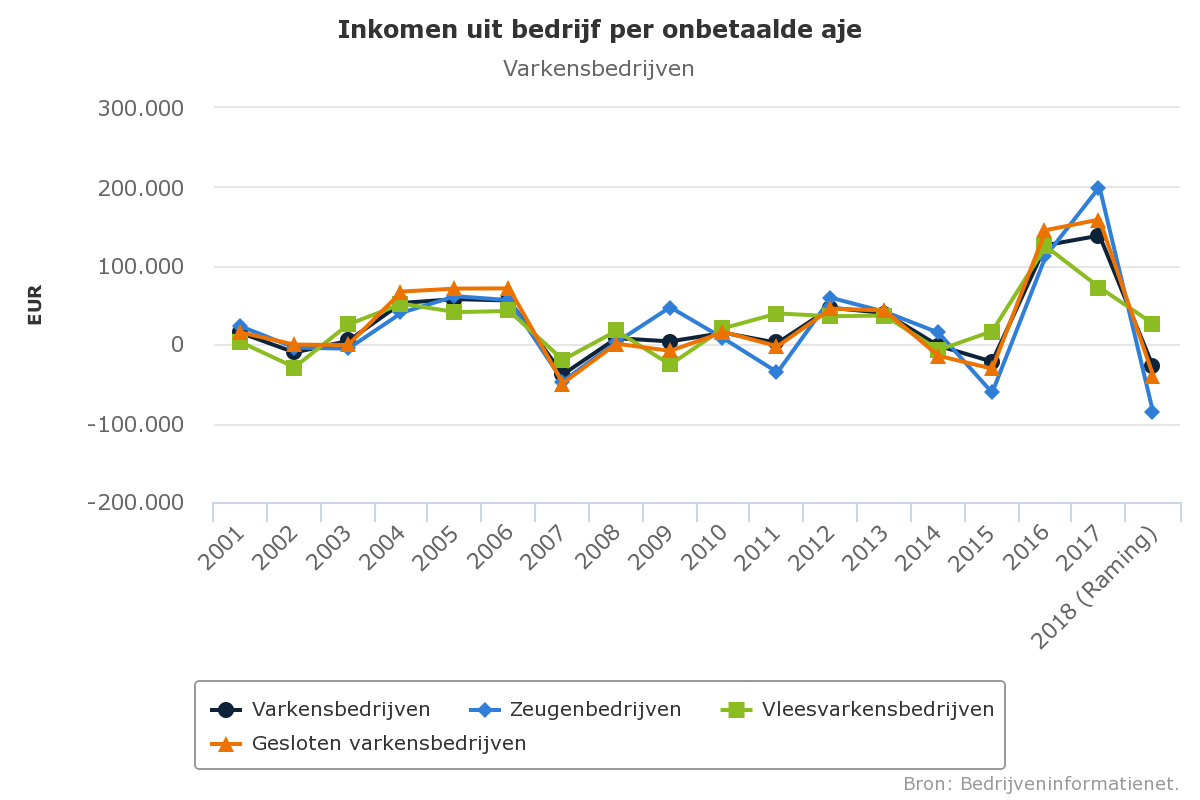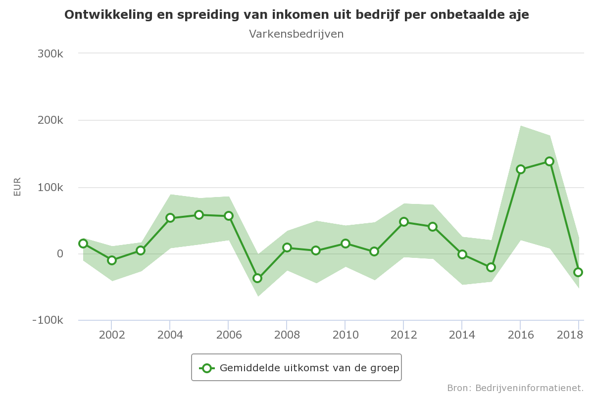 In 2018 realiseren alleen de vleesvarkensbedrijven nog een positief inkomen van 26.000 euro per onbetaalde aje doordat de kosten voor biggen fors daalden. Toch daalden deze kosten minder dan de opbrengsten van vleesvarkens. De 30% prijsdaling van biggen is echter ook de oorzaak van de forse inkomensdaling op zeugenbedrijven. Die inkomens dalen met 286.000 euro naar 86.000 euro negatief per onbetaalde aje in 2018. Ook de inkomensdaling op gesloten varkensbedrijven is fors, waardoor die varkenshouders geconfronteerd worden met een negatief inkomen van gemiddeld 39.000 euro per onbetaalde aje.