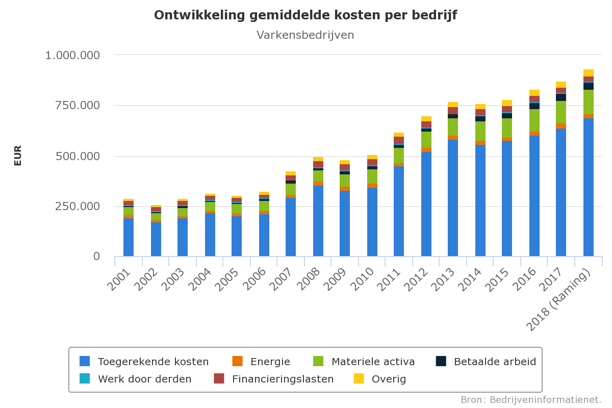 De export van mest naar Duitsland verminderde flink door de invoering van strengere milieuregels. Daardoor stegen de mestafzetprijzen voor transport over langere afstand. De totale mestkosten namen met 4.000 euro toe tot bijna 65.000 euro per gemiddeld varkensbedrijf. Alles bij elkaar stijgen de totale betaalde kosten bijna 59.000 euro per bedrijf in 2018.