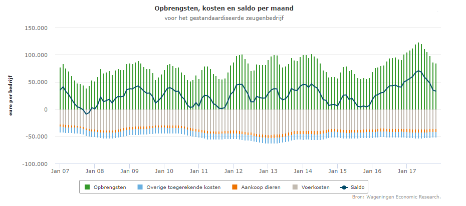 Het saldo per zeug per jaar, op basis van voortschrijdende twaalfmaandsgemiddelden, heeft van februari 2015 tot augustus 2016 onder het langjarig gemiddelde gelegen. Na het dieptepunt in december 2015 was er sprake van een stijgende trend. Over de periode december 2016 tot en met november 2017 ligt het twaalfmaandsgemiddelde net onder het hoogste niveau van de afgelopen tien jaar.