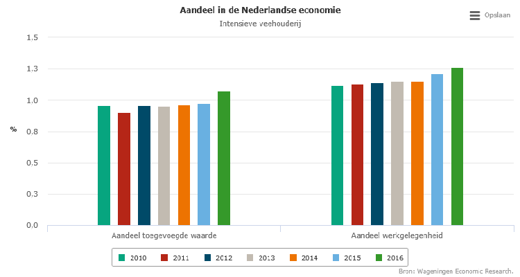 De toegevoegde waarde van het intensieve veehouderijcomplex steeg in 2016 – het meest recente jaar waarvoor de cijfers beschikbaar zijn – tot zo’n 6,8 miljard euro. De toename is vooral het gevolg van betere prijzen voor zowel eieren, vleeskuikens, biggen als vleesvarkens (zie). De toegevoegde waarde van dit complex, in 2016 zo’n 1% van de nationaal toegevoegde waarde, hangt volledig samen met de verwerking van binnenlandse agrarische grondstoffen: de import van agrarische grondstoffen door de slachterijen van varkens, pluimvee en vleeskalveren is vrijwel nihil. Evenals bij de grondgebonden veehouderij wordt de invoer van veevoergrondstoffen toegerekend aan het akkerbouwcomplex. Zo’n 51% van de toegevoegde waarde van het intensieve veehouderijcomplex kwam tot stand in de toelevering. De primaire bedrijven en de distributiebedrijven leverden een bijdrage van rond 10% aan de toegevoegde waarde, de verwerkende industrie circa 28%.