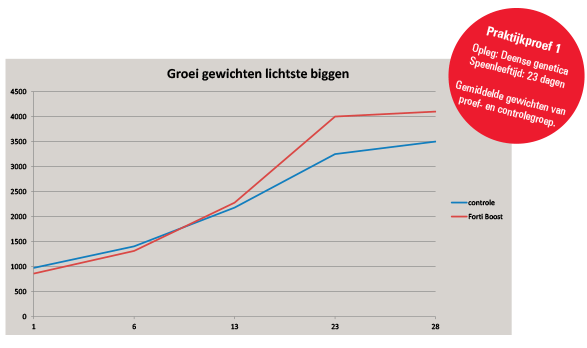 Biggen die in de kraamstalperiode Forti Boost hebben gehad zijn bij aflevering naar de vleesvarkensstal 1,2 tot 1,8 kilo zwaarder dan biggen die geen Forti Boost hebben gekregen. We benadrukken dat deze extra groei pas zichtbaar is op het moment dat de big klaar is om afgeleverd te worden als vleesvarken en niet direct na spenen. Een big bereikt eerder het aflevergewicht met minder voer.
