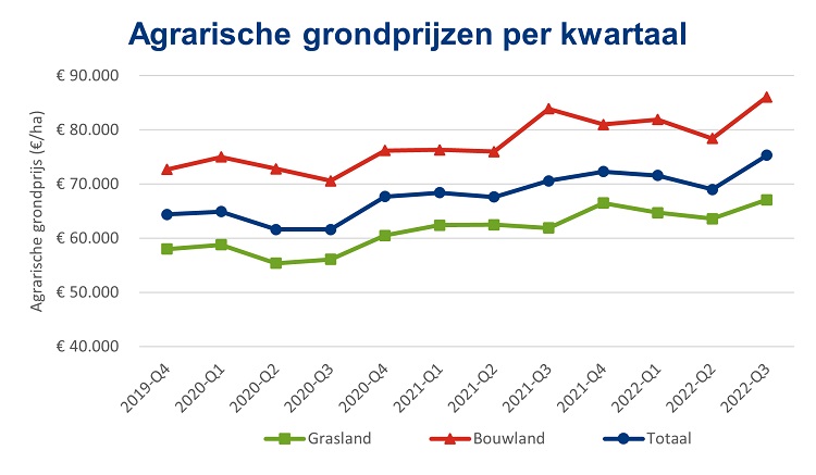 De gemiddelde prijs van grasland is in het derde kwartaal van 2022 met 5,5 procent gestegen tot 67.100 euro per hectare. Dat is ruim zes procent meer dan de gemiddelde prijs van grasland over heel 2021 (63.200 euro per ha). De gemiddelde prijs van snijmaisland is in het derde kwartaal van 2022 met 9,5 procent gestegen tot 80.500 euro per hectare. De prijs van dit grondgebruik is niet afzonderlijk in de figuur opgenomen, maar is wel onderdeel van het totaalcijfer van landbouwgrond.