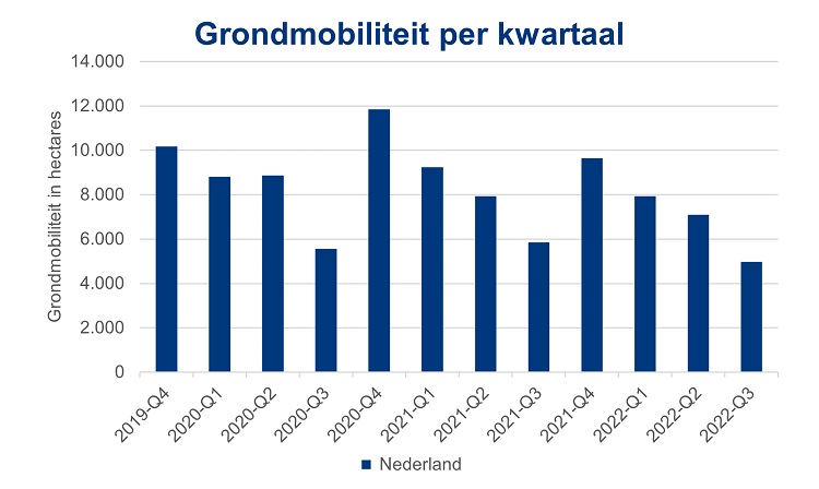 In het derde kwartaal van 2022 is 5.000 hectare landbouwgrond verhandeld, bijna 900 hectare, 15 procent, minder dan in hetzelfde kwartaal van 2021. Gemeten over de laatste vier kwartalen (vierde kwartaal 2021 tot en met het derde kwartaal 2022) is in totaal 29.600 hectare grond in andere handen overgegaan. Dat is 5.200 hectare, 15 procent, minder dan in dezelfde periode een jaar eerder (2020/2021).