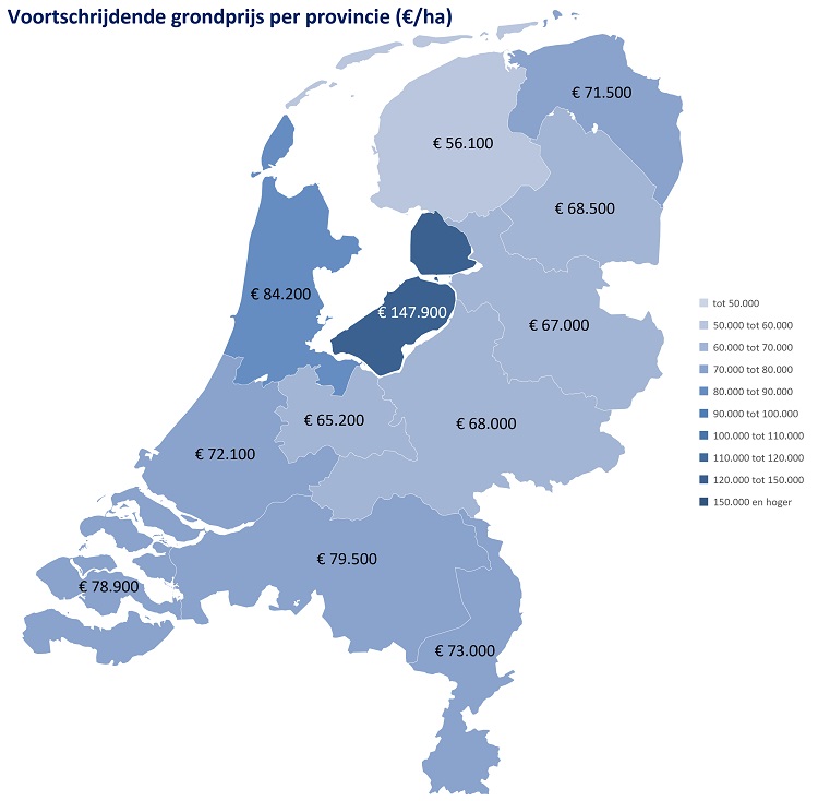 De gemiddelde agrarische grondprijs loopt in het derde kwartaal van 2022 uiteen van 56.100 euro in Fryslân tot maar liefst 147.900 euro per hectare in Flevoland. In de overige provincies varieert de grondprijs in het derde kwartaal van 2022 tussen 65.200 euro in Utrecht en 84.200 euro per hectare in Noord-Holland.