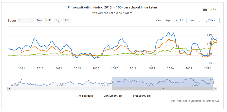 De consumentenprijsindex voor varkensvlees is in juli 2022 verder gestegen naar 133 punten, een forse toename ten opzichte van de 116 punten in januari van dit jaar. Ook de prijsindices in de verwerkende industrie, 140 punten in juli 2022, en af boerderij (144 punten) liggen duidelijk hoger dan begin dit jaar. De kosten van energie en voer zien echter ook forse stijgingen.