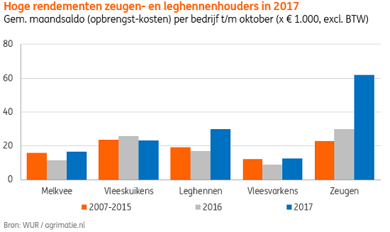 De zeugenhouderij kende in 2017 een uitstekend jaar, ondanks de recente daling van de biggenprijzen. Het rendement van een zeugenhouder was tot en met oktober het dubbele van het langjarig gemiddelde. Voor houders van vleesvarkens en vleespluimvee was 2017 een gemiddeld jaar. De verwachtingen voor 2018 zijn op basis van de verwachte groei van de consumentenbestedingen in binnen- en buitenland positief.
