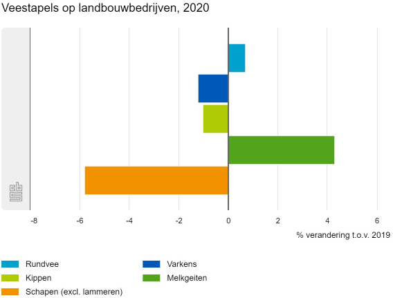 Het aantal bedrijven met varkens is met 12,0 procent afgenomen van ruim 4 duizend in 2019 naar 3,6 duizend in 2020. De varkensstapel is gekrompen met 1,2 procent naar ruim 12 miljoen varkens. Het aantal melkgeiten is het laatste jaar opnieuw toegenomen en ook de rundveestapel werd iets groter. Dat blijkt uit de voorlopige cijfers van de Landbouwtelling 2020.