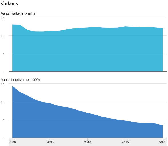 De omvang van de Nederlandse varkensstapel schommelt al jaren rond de 12 miljoen. De varkens staan evenwel op steeds minder bedrijven. Het aantal bedrijven met varkens is afgenomen van 14,5 duizend in 2000 tot 3,6 duizend in 2020. Het gemiddeld aantal varkens per bedrijf nam toe van 900 in 2000 naar 3 400 in 2020.