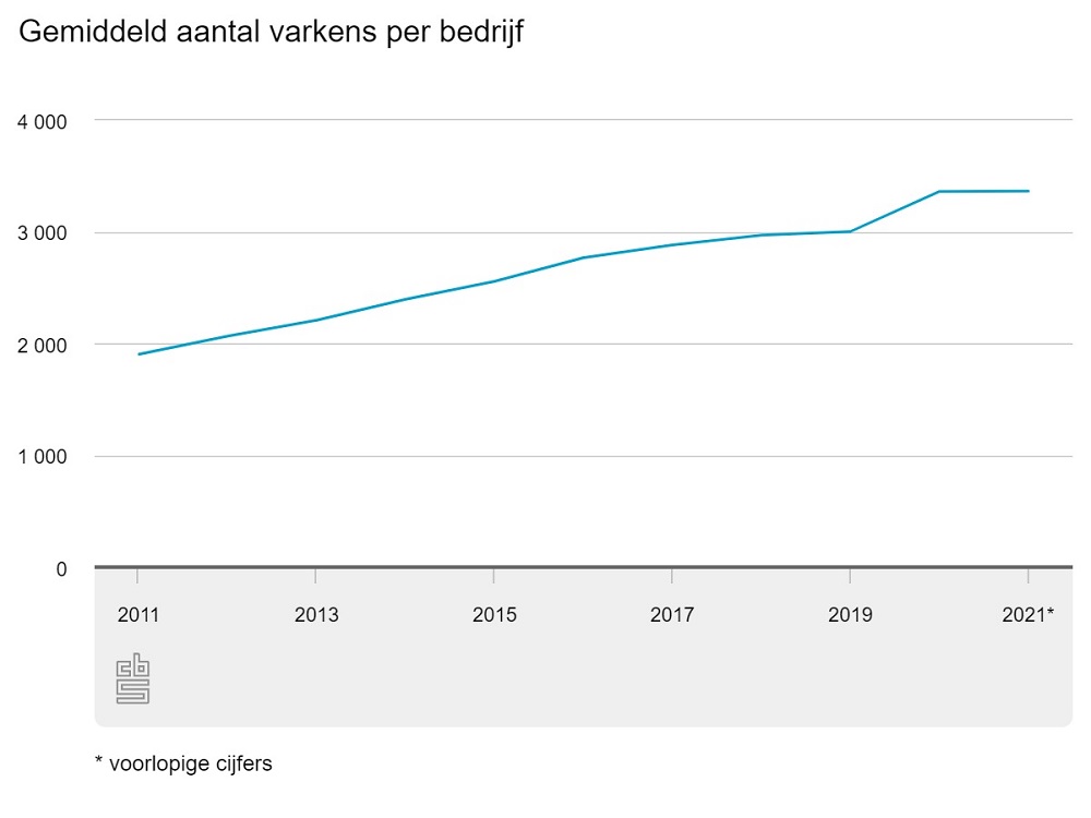 Het gemiddeld aantal varkens per bedrijf verdubbelde bijna van 1900 in 2011 naar 3400 in 2021. De grootste bedrijven zijn gevestigd in Limburg en Noord-Brabant met gemiddeld respectievelijk 5300 en 4800 varkens.