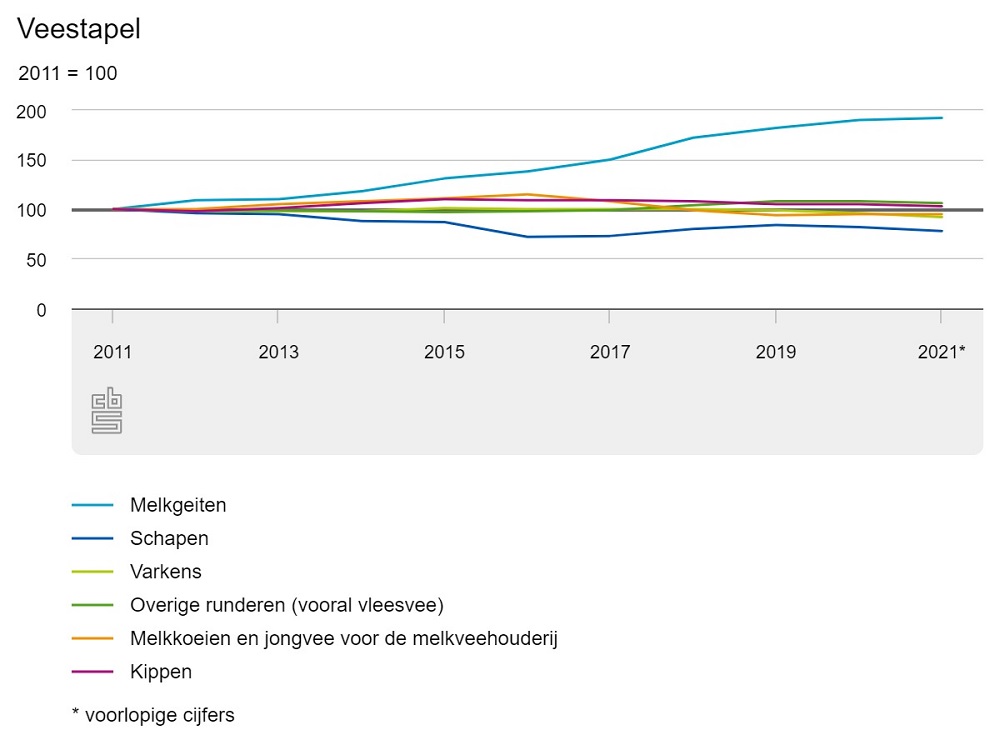 De Nederlandse varkensstapel kromp in 2021 iets naar bijna 11,4 miljoen varkens. De rundveestapel bleef met 3,8 miljoen nagenoeg gelijk. Het aantal melkgeiten steeg in een jaar tijd licht naar 482 duizend, het aantal schapen daalde naar 848 duizend. De omvang van de kippenstapel nam af naar bijna 100 miljoen dieren. Dit blijkt uit voorlopige cijfers van de Landbouwtelling 2021.
