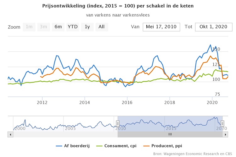 De opbrengstprijzen voor slachtvarkens volgen sterk de industrieprijs, de index van af boerderij prijzen staat op 112, dat is weliswaar 1,8% hoger dan in juli, maar 24% lager dan vorig jaar. Deze historisch forse daling van de af boerderijprijs, zet zich naar verwachting door richting het eind van 2020. Ook de ontwikkeling van de biggenprijs toont aan dat er nog geen perspectief is op serieus marktherstel. Het is daarmee denkbaar dat 2021 van start zal gaan met grote vraagtekens over de winstgevendheid van de verschillende schakels in de productieketen.
