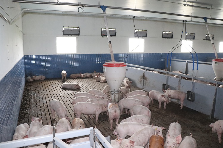 De nieuwe vleesvarkensstal is extreem goed geïsoleerd en er hoeft alleen iets verwarmd te worden bij aanvang van de ronde. Klewenhagen: “En dat werkt. Het was hier deze winter soms min 10 ºC buiten en in de stal is het dan nog zeer behaaglijk met 20 ºC.” Dat komt niet alleen door de geïsoleerde muren en overal dubbel glas. Aan een kant van de stal zit namelijk ook een aparte centrale gang, waardoor je zeer goede isolatie hebt.