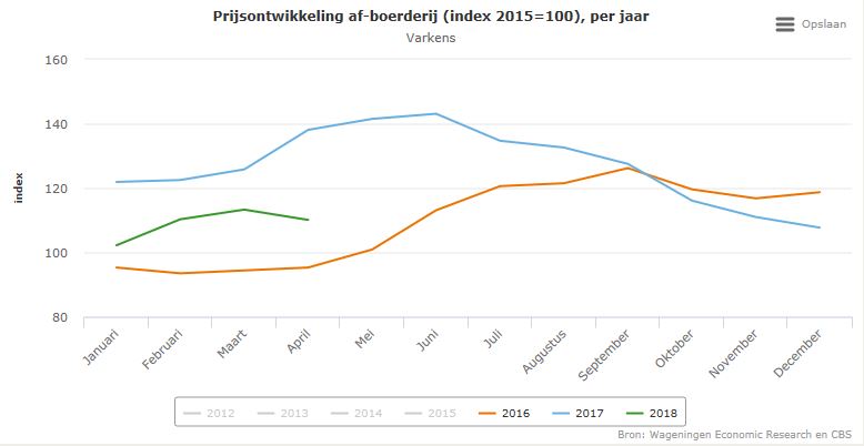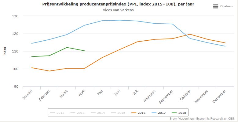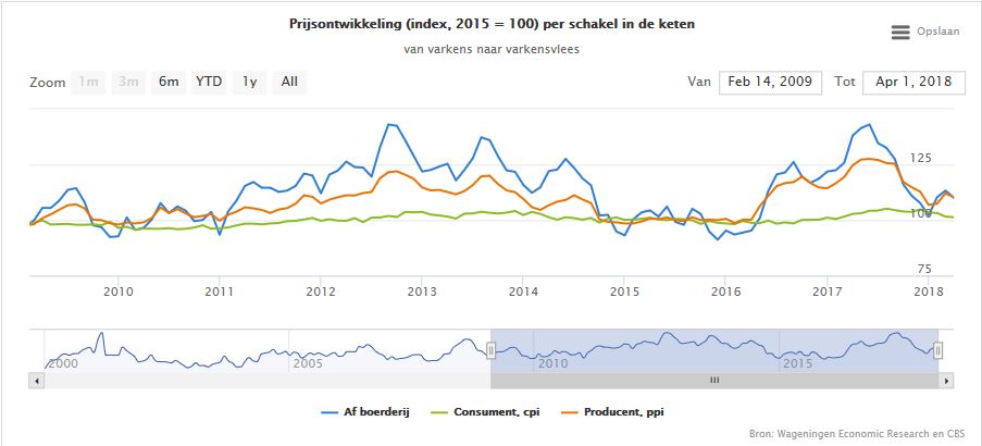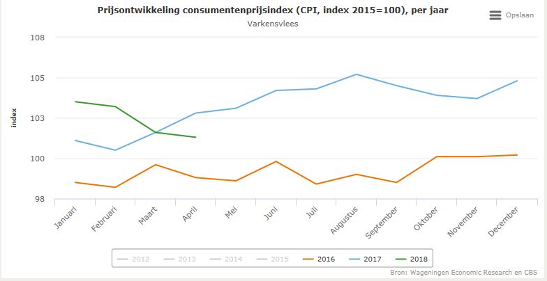De consumentenprijs van varkensvlees laat vanaf augustus 2017 een duidelijke daling zien. De prijs stond toen op een niveau van 105 punten en deze is gedaald naar 101 punten in april 2018. Deze ontwikkeling ligt in lijn met de lagere prijzen van de industrie (110 punten in april, ten opzichte van 127 punten medio 2017) en de prijs van vleesvarkens af boerderij (110 punten in april, ten opzichte van gemiddeld 139 punten medio 2017). Prijsschommelingen zijn bij de consument altijd kleiner dan bij de industrie en veel kleiner dan af boerderij.