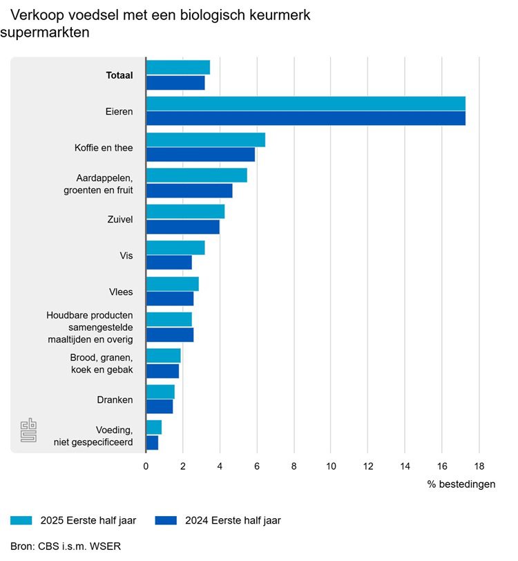 In het eerste halfjaar van 2025 ging 3,5 procent van de bestedingen aan voedsel in de Nederlandse supermarkten naar producten met een biologisch keurmerk (820 miljoen euro). In de periode 2018 tot en met 2024 was dat gemiddeld 3,0 procent. Bij eieren is het aandeel biologische verkopen relatief het grootst, gevolgd door koffie en thee. Dit meldt het Centraal Bureau voor de Statistiek (CBS) op basis van de BioMarktMeter en de Monitor Duurzaam Voedsel, uitgevoerd in samenwerking met Wageningen Social & Economic Research (WSER).