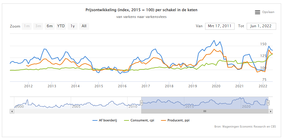 De consumentenprijzen van varkensvlees zijn in mei 2022 gestegen tot 131 punten (2015 =100), een stijging van 9 procent ten opzichte van maart. Sinds begin 2022 heeft de stijging van de consumentenprijzen een versnelling ingezet. Vanaf maart stegen ook de industrieprijs en af-boerderijprijs sterk. De indices van de industrieprijs en de af-boerderijprijs bereikten in april een niveau van respectievelijk 141 en 149 punten. Aan die stijging is een eind gekomen. In mei zijn de industrieprijs en af-boerderijprijs weer met 5 procent gedaald.