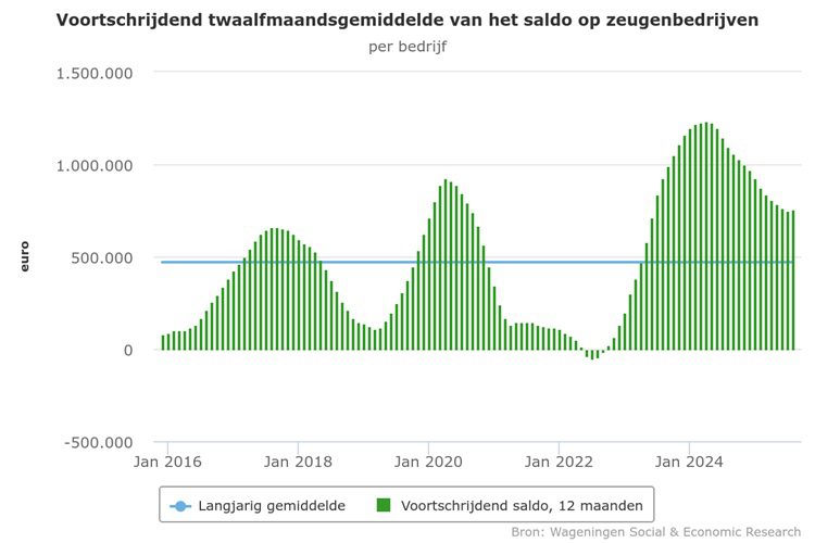 Hoewel het maandsaldo in de zomermaanden sterk terugliep, bleef het resultaat over de eerste acht maanden van 2025 redelijk positief. Het voortschrijdend saldo over twaalf maanden – van september 2024 tot en met augustus 2025 – bedroeg circa 760.000 euro per bedrijf, duidelijk hoger dan het langjarig gemiddelde van 470.000 euro per jaar (2015-2024).