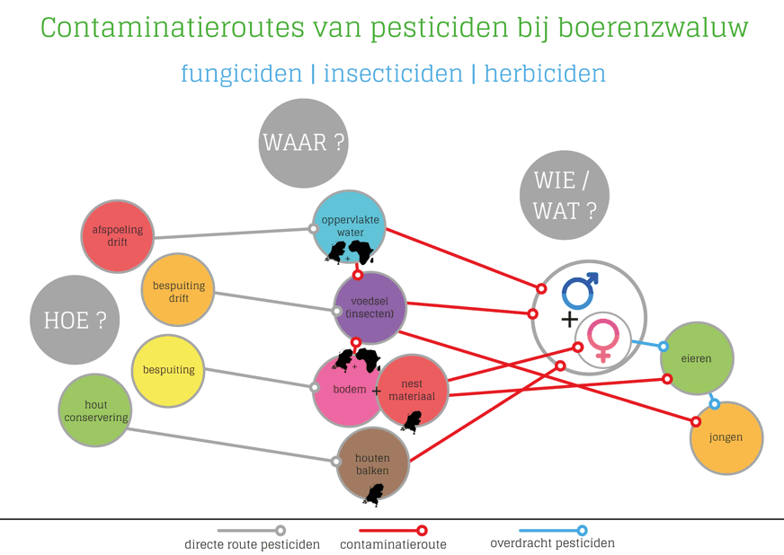 Naar alle waarschijnlijkheid komen de meeste pesticiden via het voedsel, insecten, in de zwaluwen terecht. Insecten komen in aanraking met middelen die gebruikt worden in landbouwgewassen. De route via vliegenbestrijding in stallen speelt ook een rol. Maar ook pesticiden in het water kunnen een bron van besmetting zijn via drinken of doordat insecten als larve in het water leven en later als volwassen dieren rondvliegen. Daarnaast kan ook het nestmateriaal een mogelijke besmettingsroute zijn. Denk hierbij aan grond, veren en haren, houtverduurzamingsmiddelen in de balken waar de zwaluwen tegenaan nestelen. Via de moedervogel komen de pesticiden in de eieren en dus in de jonge vogels terecht. Zie onderstaand schema van de contanimatieroutes.