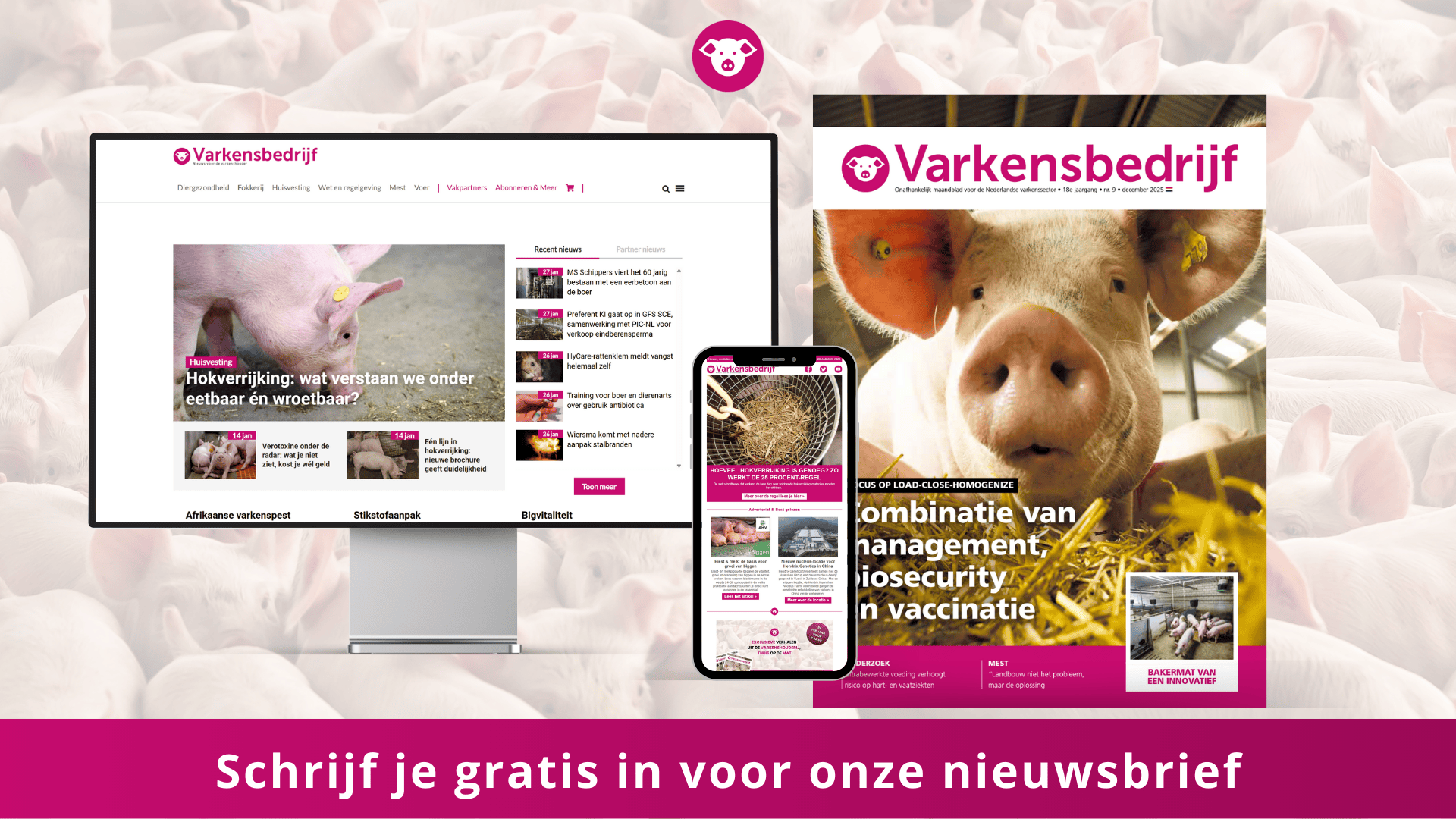 Varkensbedrijf is een onafhankelijk platform voor de Nederlandse varkenssector. Het behandelt alle aspecten van de varkenshouderij met een frisse blik om een goed beeld te geven van de sector. Wekelijks op de hoogte blijven van alles wat er speelt in de varkenshouderij? Schrijf u in op de nieuwsbrief van Varkensbedrijf.