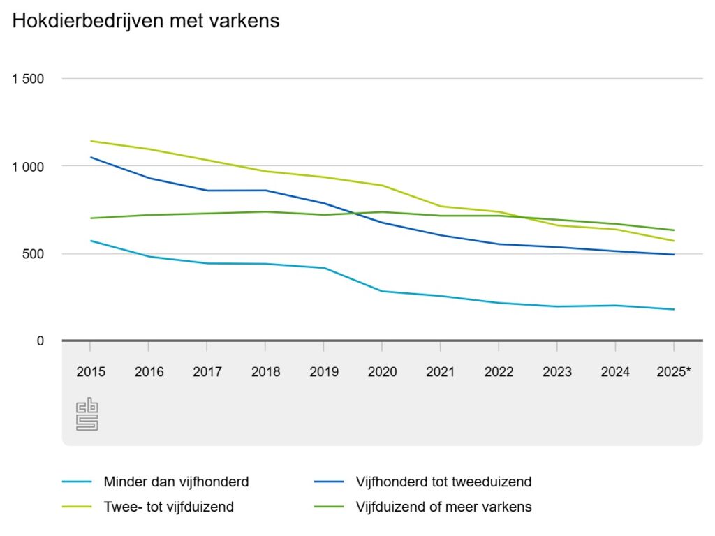 Doordat vooral de kleinere bedrijven zijn gestopt is het gemiddeld aantal varkens per hokdierbedrijf gestegen, naar vijfduizend in 2025. Dat is bijna 50 procent hoger dan tien jaar eerder en 2,4 procent hoger dan een jaar eerder.