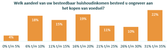 Van de 1560 ondervraagde respondenten geeft 77% aan meer dan 10% van het besteedbaar inkomen aan voedsel uit te geven. Slechts 18% denkt tussen de 6% t/m 10% van het inkomen te besteden, en maar 4% geeft aan minder dan 5% aan voedsel te besteden. De realiteit is dat een doorsnee gezin in 2018 slechts 8% aan voeding besteedde (CBS, 2019).