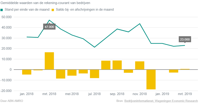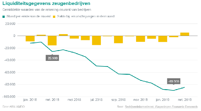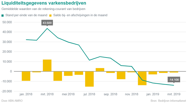 De rekening-courantpositie van varkensbedrijven is in het eerste kwartaal van 2019 ruim 5.000 euro verslechterd ten opzichte van het vierde kwartaal, en kwam eind maart uit op -14.000 euro. Vorig jaar maart was de gemiddelde stand nog bijna 44.000 euro. Daarna ging de rekening-courantpositie vrijwel elke maand verder omlaag.
