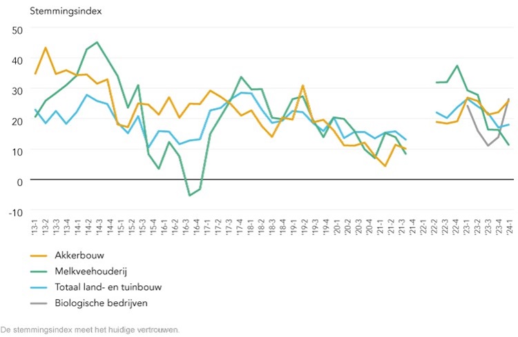 Akkerbouwdeskundige van Wageningen Economic Research Mark Manshanden geeft aan dat de stijging van de stemmingsindex in de akkerbouw een combinatie zal zijn van afzwakking van beleid en opbrengstprijzen “De oogst van 2023 was lastig, dit heeft letterlijk sporen (verdichting) in het veld achtergelaten, waar de akkerbouwer dit kwartaal wat mee moet. Tegelijk is er vanuit Brussel nu het signaal dat er op de rem wordt getrapt met verduurzaming. Voor veel akkerbouwers zal dit wat druk wegnemen. Met name op het gewasbeschermingsdossier zal het loslaten van de duurzaamheidsdoelen voor 2030 positief zijn ontvangen”, zegt Manshanden.