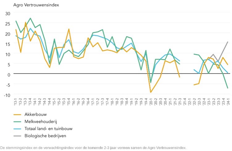 De resultaten over het eerste kwartaal van 2024 tonen aan dat biologische boeren met meer vertrouwen naar de toekomst kijken. Met de nieuwe index is beoogd meer inzicht te krijgen in de overeenkomsten en verschillen tussen biologische en niet-biologische boeren.