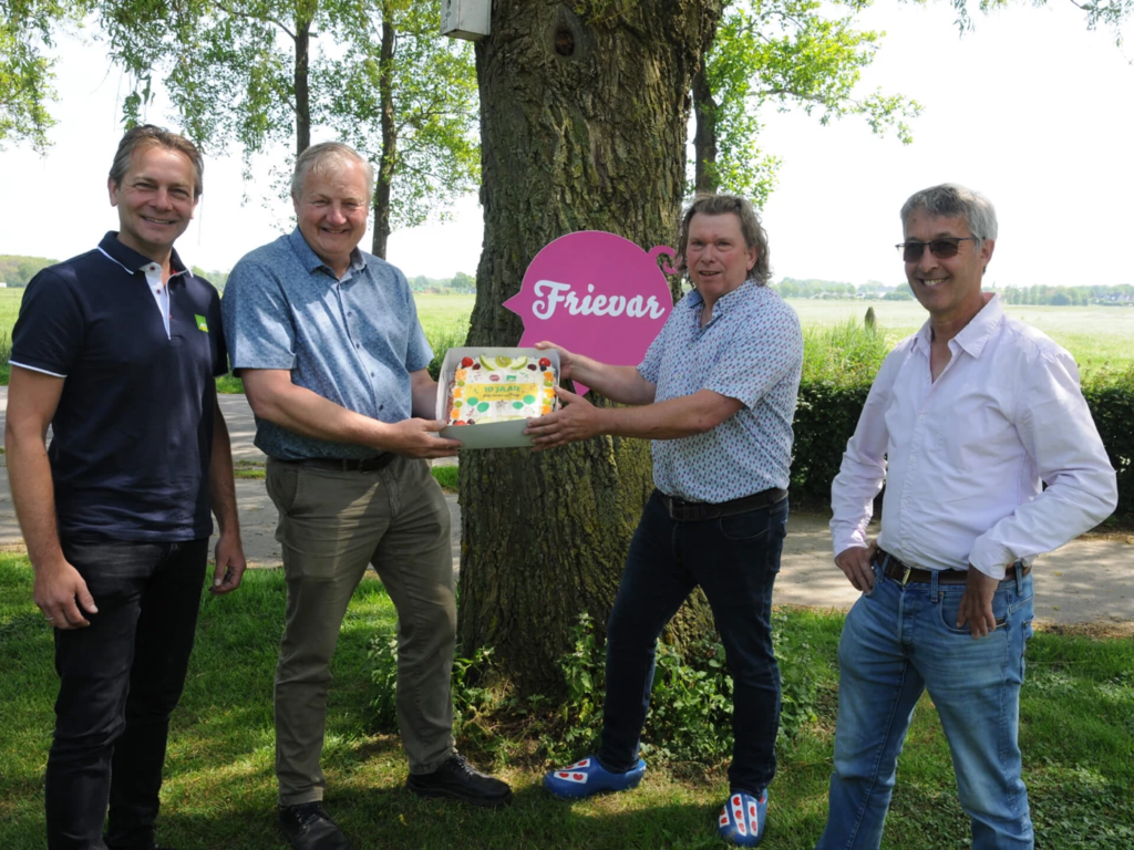 Sinds 2013 produceert AR als ketenpartner van Frievar voer voor varkenshouders die deelnemen aan deze keten. Om de 10-jarige samenwerking te vieren togen Eelco van de Hoef en Johan Schuttert naar Friesland om een taart te overhandigen aan Frievar.
