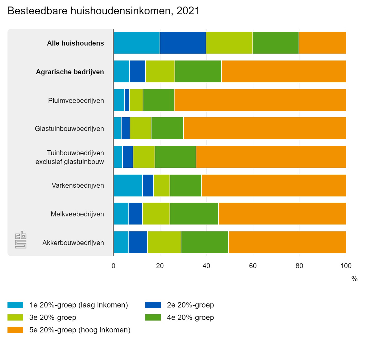 Van de agrarische huishoudens met een melkveebedrijf in 2021 behoorde 54,7 procent tot de 20 procent huishoudens met de hoogste inkomens in Nederland. Onder de pluimveebedrijven was dat 73,6 procent. Gemiddeld viel 53,0 procent van de huishoudens met een bedrijf in de agrarische sector in de hoogste inkomensgroep. Alleen akkerbouwers hadden een lager inkomen dan het gemiddelde van alle agrarische bedrijven.