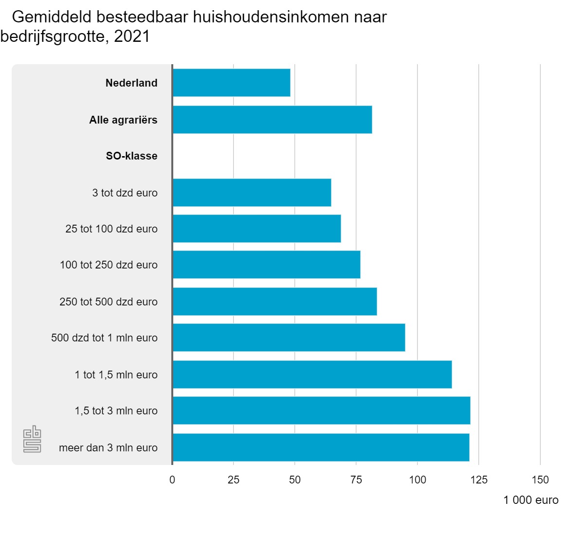 Naast bedrijfstype speelt ook bedrijfsgrootte een rol in de hoogte van het huishoudensinkomen en het armoederisico. Agrarische huishoudens in de laagste SO-klasse hadden in 2021 een gemiddeld inkomen van 65 duizend euro. De SO-klasse is een gestandaardiseerde maat voor de economische omvang van agrarische bedrijven, gebaseerd op de opbrengst die gemiddeld op jaarbasis per gewas of diercategorie wordt behaald. Agrarische huishoudens in de hoogste SO-klasse hadden een gemiddeld inkomen van 122 duizend euro.