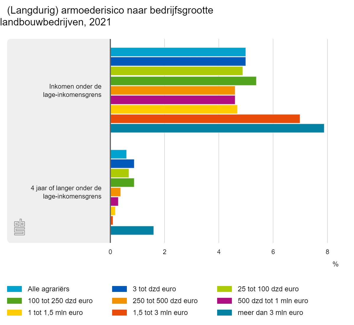 Dat het risico op armoede niet structureel hoeft te zijn, blijkt uit het langdurig armoederisico. Van de huishoudens met een melkveebedrijf had 0,7 procent in tenminste de laatste vier jaren een inkomen onder de lage-inkomensgrens. Onder varkensbedrijven was dat 0,3 procent en voor glastuinbouwbedrijven was dit 0,4 procent. Glastuinbouwbedrijven hebben relatief vaker rechtspersoonlijkheid en bedrijven met rechtspersoonlijkheid zijn buiten beschouwing gelaten.