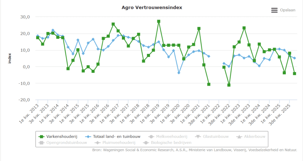 Het vertrouwen dat varkenshouders in hun onderneming hebben, is in het vierde kwartaal van 2025 gedaald naar het lage niveau dat ook in het tweede kwartaal van dit jaar werd gerealiseerd. Met een daling van ongeveer 12,5 punten zakte het vertrouwen onder het nulpunt.
