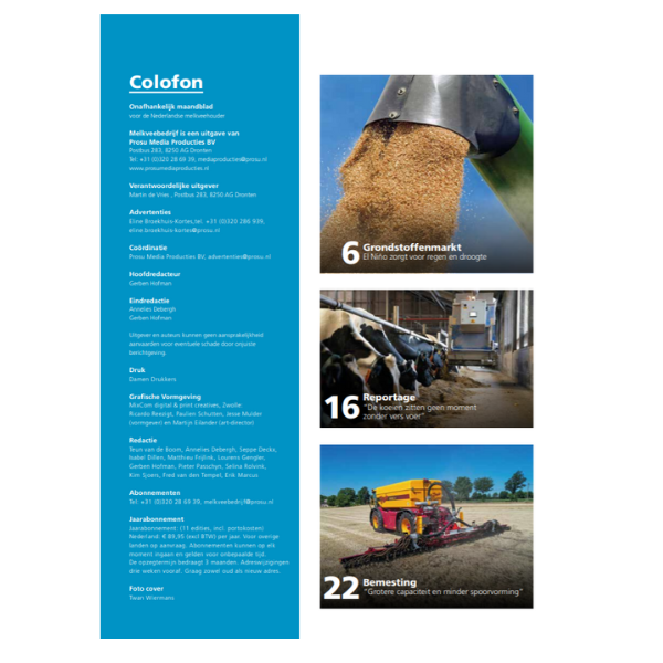 Een combinatie abonnement op vakblad Varkensbedrijf en Melkveebedrijf kan op elk moment in het jaar starten. Varkensbedrijf komt negen keer en Melkveebedrijf komt elf keer per jaar uit. Bekijk de uitkomstdata hier van Varkensbedrijf en hier van Melkveebedrijf bij ‘verschijningsdata en thema’s’. Wil je er zeker van zijn dat je een bepaalde editie dit jaar nog krijgt, probeer dan dat je een maand voor de verschijningsdatum aan te houden om een abonnement af te sluiten.