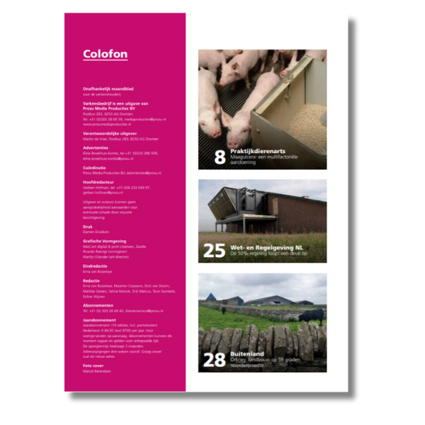 Met een abonnement op Varkensbedrijf en Melkveebedrijf ontvang je de belangrijkste vakkennis voor elke veehouder. Vakblad Varkensbedrijf behandelt alle ontwikkelingen binnen de veehouderij waarmee elke veehouder zich kan voorbereiden op de varkenshouderij van morgen. Het geeft een kijkje achter de schermen bij collega-ondernemers en laat zien hoe zij hun bedrijf managen.