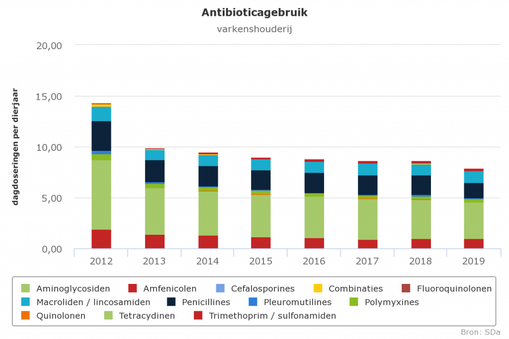 In 2019 is het gemiddeld antibioticagebruik bij varkens 7,95 dagdoseringen per dierjaar, iets lager dan de jaren ervoor. Meer gedetailleerde cijfers laten zien dat het gebruik bij zeugen/zuigende biggen (3,5) en vleesvarkens (3,8) een stuk lager ligt dan bij gespeende biggen (16,8). Het antibioticagebruik bij gespeende biggen is daarmee met ruim 15% gedaald.