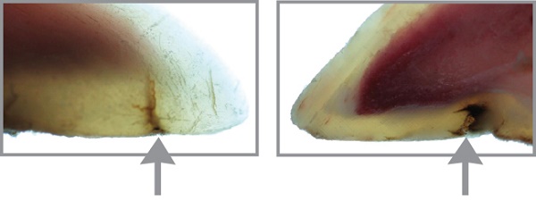 Een ander gebied waar scheuren en laesies ontstaan in de klauw van de zeug is de witte lijn tussen de verticale klauwwand en de zool.